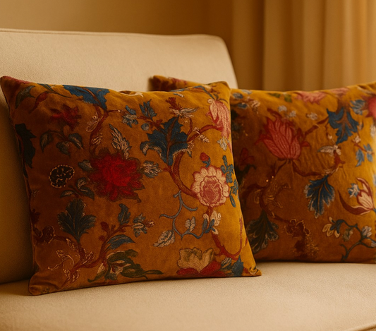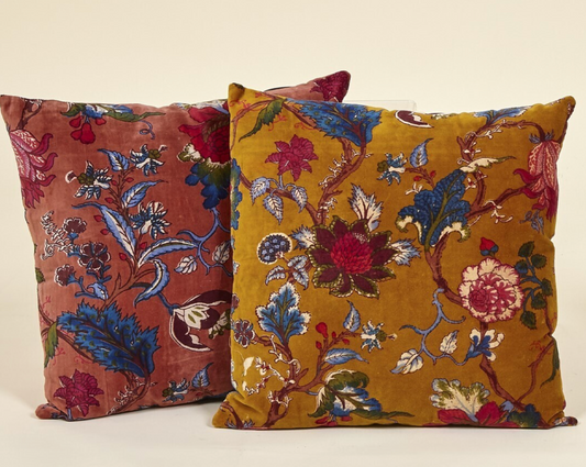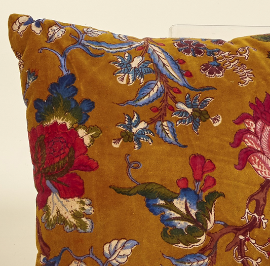 Cojín terciopelo mostaza flores