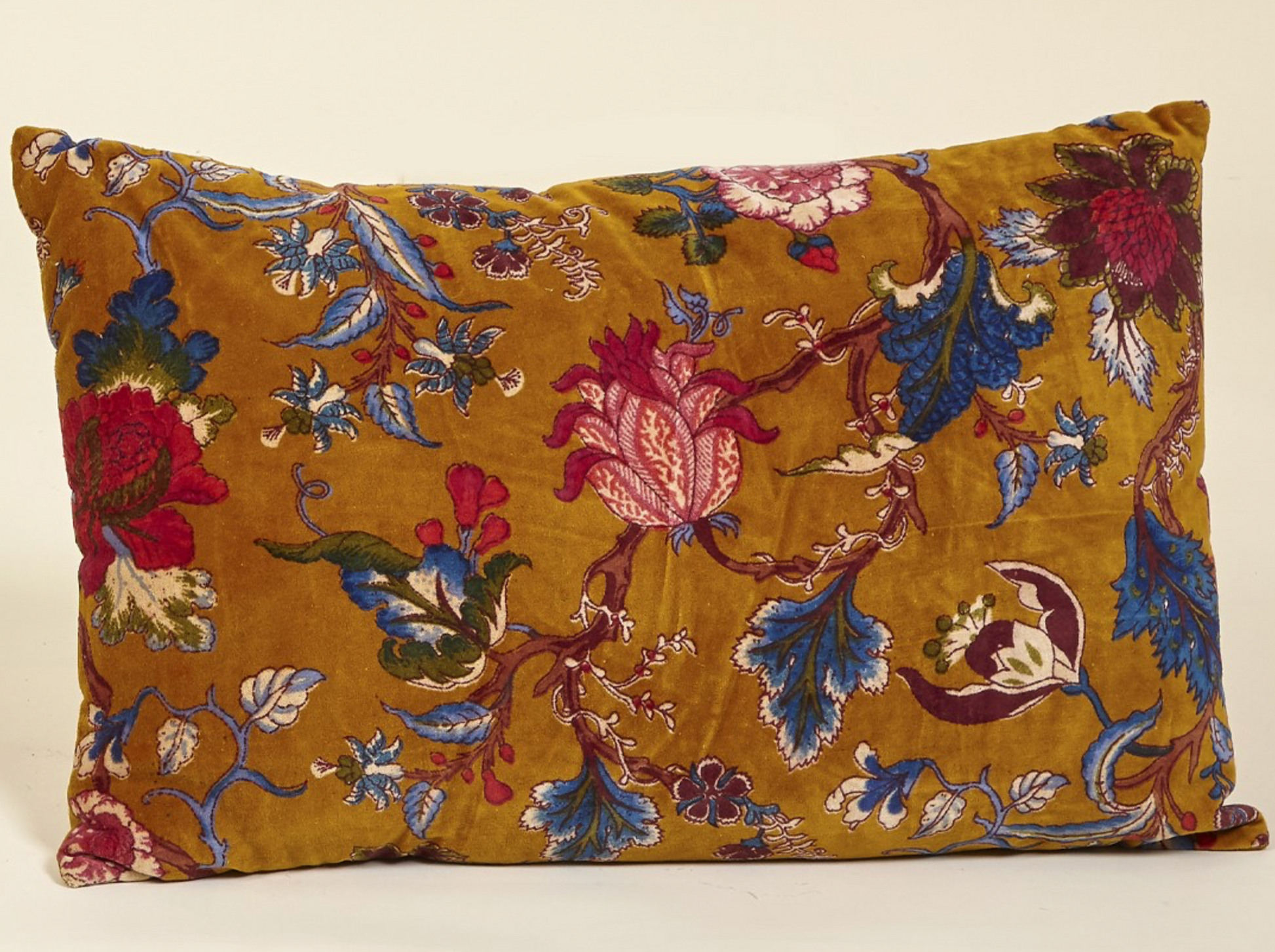 DESCRIPCION: cojín estampado de terciopelo , en color mostaza. Relleno incluido