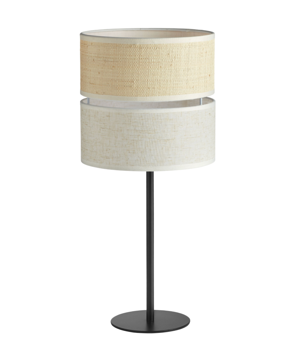 DESCRIPCION: Lampara sobremesa con pie metálico en negro y pantalla de Ratan y lino